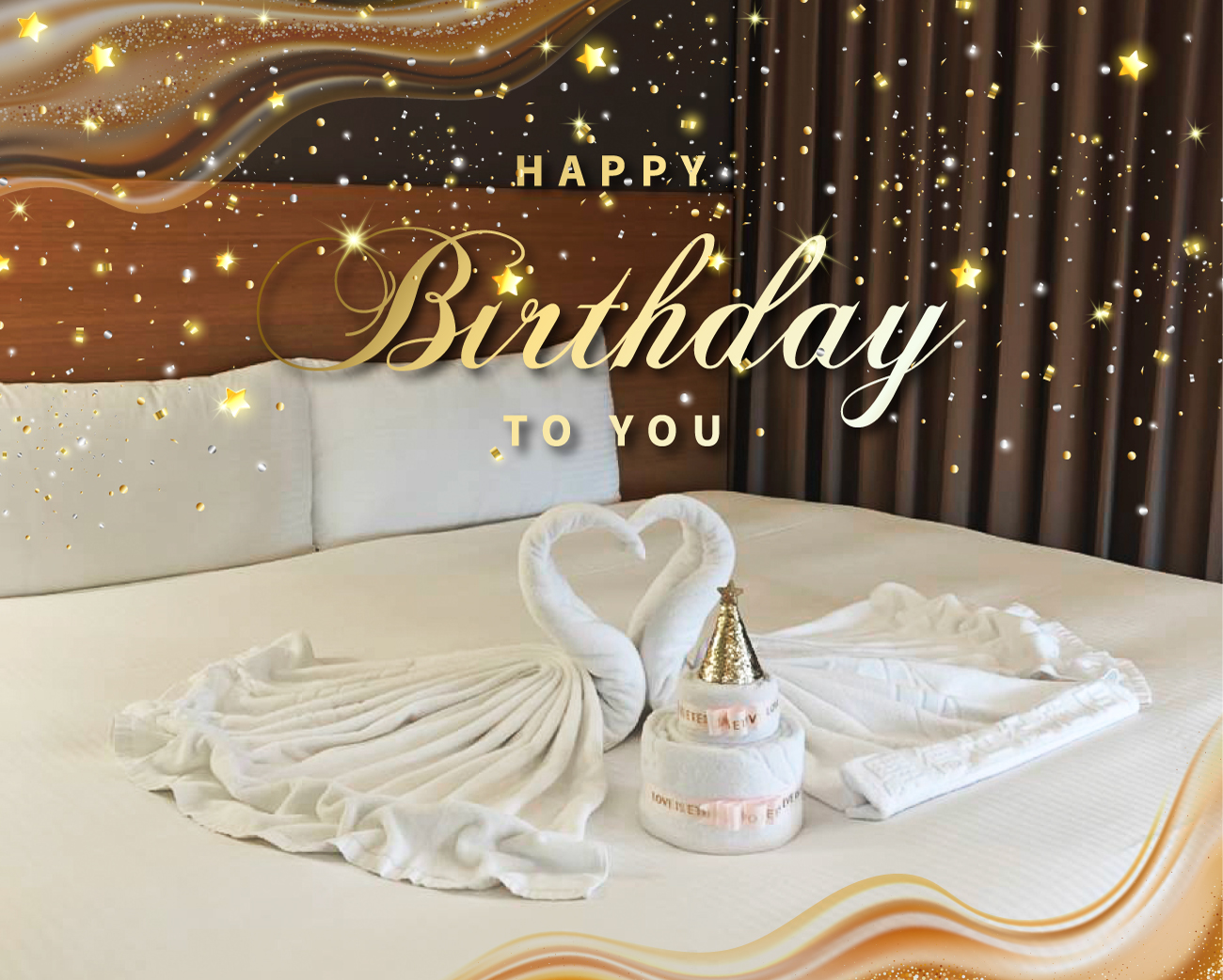 入住即可享有專屬生日客房布置,搭配可愛的🦢天鵝造型毛巾與🎂蛋糕造型毛巾,讓祝福一走進房門就到位